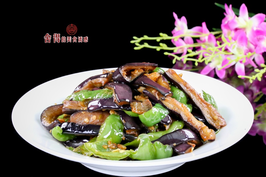 3、鍋燒熱,倒入肥肉,加適量的水把肉化開,水干后小火熬出豬油,倒入蒜蓉和豆豉,小火炒香,炒香后轉大火,倒入大青椒一起煸炒,青椒變色倒入茄子,腌過的茄子有鹽味,只加老抽即可,老抽用水化開可是顏色均勻,炒的時候沿鍋邊淋入少量的水,炒出的茄子色澤靚麗又不油膩,青椒變軟,加入適量的雞精翻炒均勻,即可起鍋。