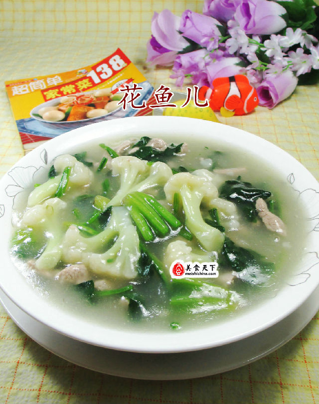 食材:里脊肉(已切)、花菜(已清洗)、菠菜(已洗凈切開)、水淀粉