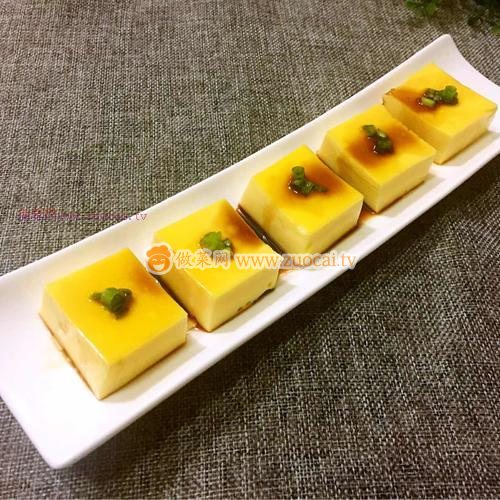11.然后把砧板蓋在容器上,然后倒扣,取出容器,再利用菜刀小心翼翼的把雞蛋羹翻過來,切成小塊