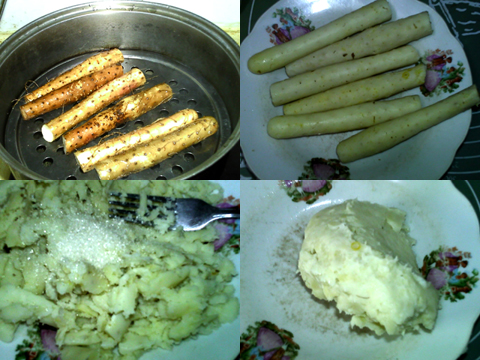 1、山藥洗凈切段,放入沸水鍋中蒸15-20分鐘。熟透出鍋。去皮。碾成泥,加入白糖。拌勻成粘稠團(tuán)狀。