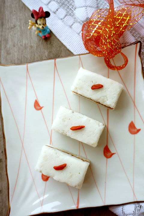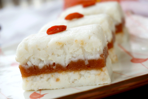 2、取一半,放入鋪有保鮮膜的模具中,壓實(shí)。鋪一層山楂糕,再將剩下的山藥泥鋪在表面,壓實(shí)抹平。扣出。去掉保鮮膜,切成大小均等的塊。放入盤中,表面用枸杞點(diǎn)綴。