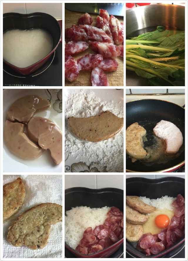 主料: 靚禾香米 250克、 鵝肝 3片、 臘腸 1.5根、 雞蛋 1個(gè)、 廣東菜芯 5棵