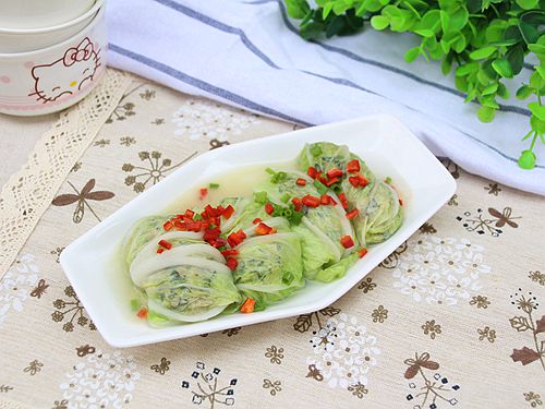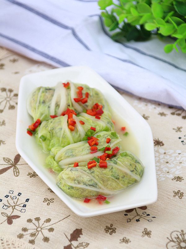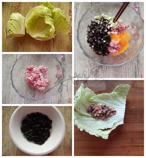 5、取一張白菜葉,放上適量肉末餡,包好。