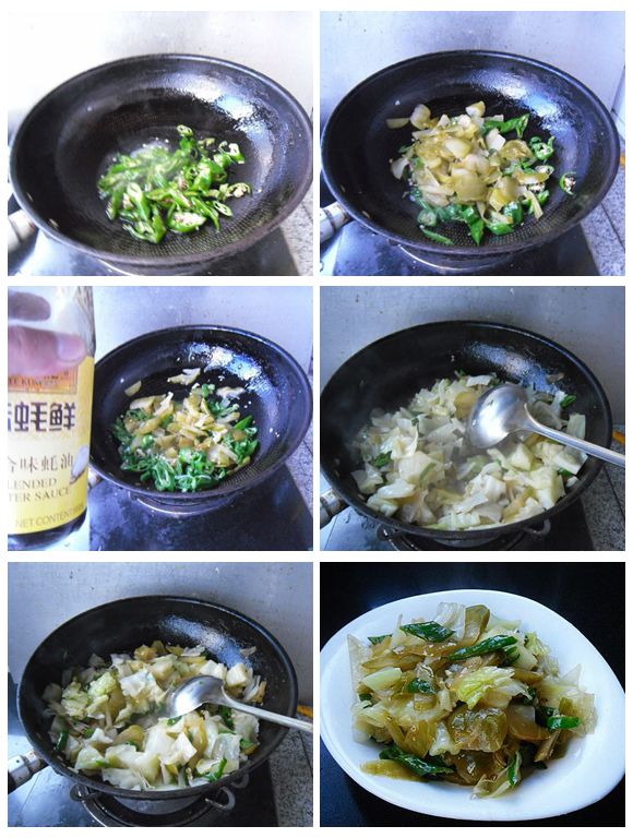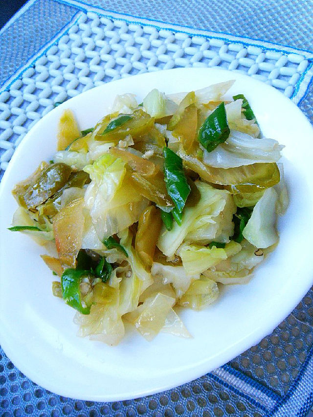 2、包心菜提前焯至熟透,可以加快菜肴的烹制過(guò)程,使尖辣椒、榨菜有脆嫩的口感。