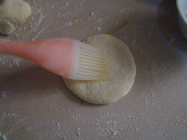 5,摁扁,搟成中間厚邊緣薄的小餅,中間劃圈刷上一層油。