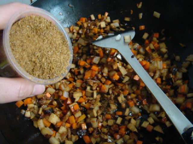 16,加入孜然粉炒出香味。再加點(diǎn)鹽定好味。