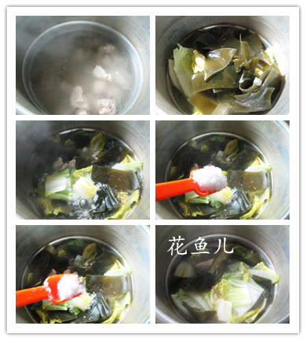 (3)然后,合入已切好的白菜和海帶翻動一下煮開至熟。