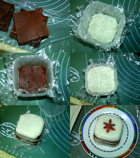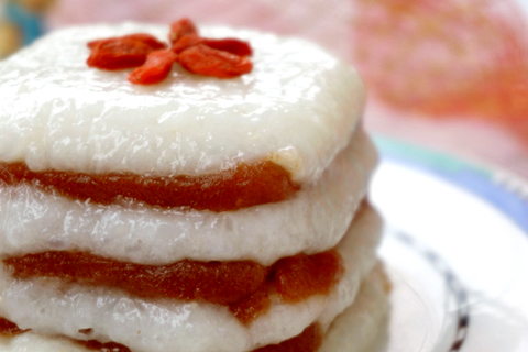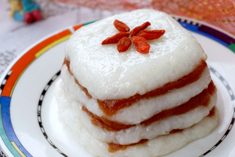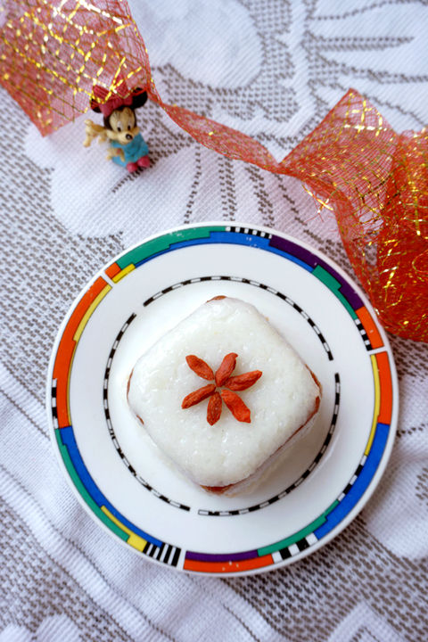 2、將山楂糕切成模具的形狀,厚約3-5毫米。用手粘水,取適量糯米團(tuán),放入鋪有保鮮膜的容器中,鋪平。糯米上鋪一層山楂糕,如此交疊,共鋪五層。在第五層上鋪上糯米。牽拉保鮮膜,扣出糯米糕。移入盤中,表面擺放枸杞點(diǎn)綴。
