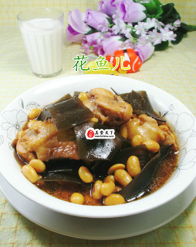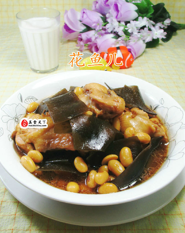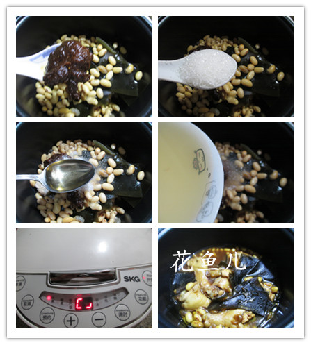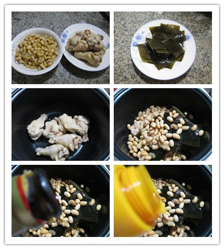 食材:黃豆(已泡發(fā)清洗煮熟)、雞翅根(已清洗焯水)、海帶(已泡發(fā)清洗切開)