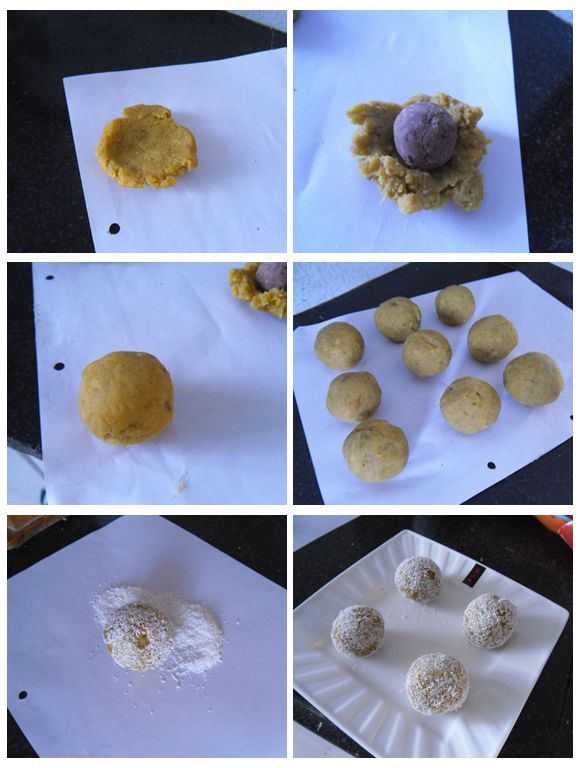 11、取一個(gè)薯球毛坯,滾蘸椰蓉。12、依次滾蘸后,即可上桌。