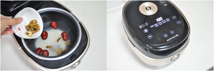 3、放入沖洗干凈的核桃,選擇煮粥功能,出鍋后撒上黑芝麻即可。