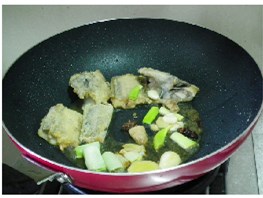 6、小火煎制兩面金黃后,下入蔥姜蒜和八角爆香。