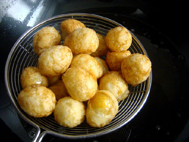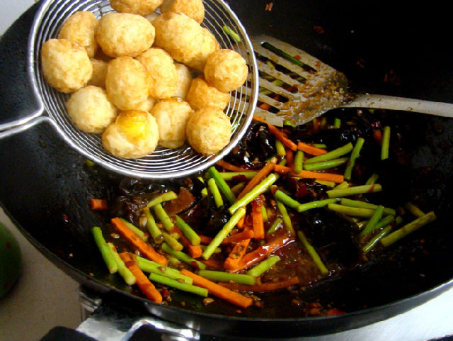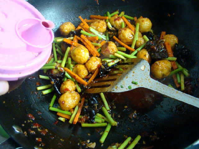 8,再倒入炸好的鵪鶉蛋翻炒均勻。