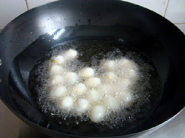 3,鍋放火上,添入適量油,6成熱時下入鵪鶉蛋。