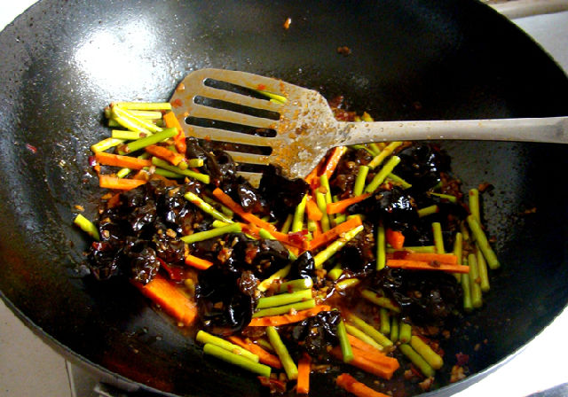 7,下入蒜苔、黑木耳、紅蘿卜炒出香味。