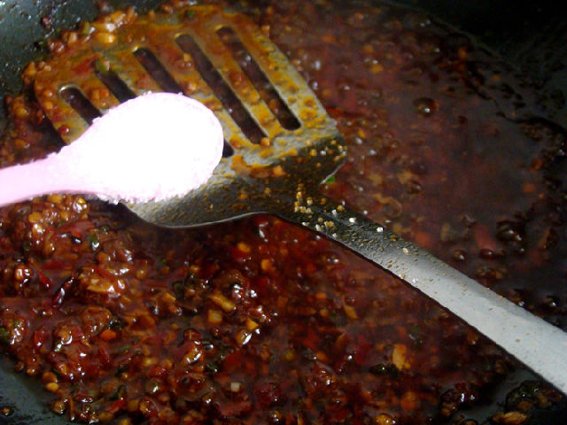 5,把鍋內(nèi)多余的油倒出,留少許底油,5成油溫時下入郫縣豆瓣醬煸出紅油,放入蔥姜蒜末炒出香味。