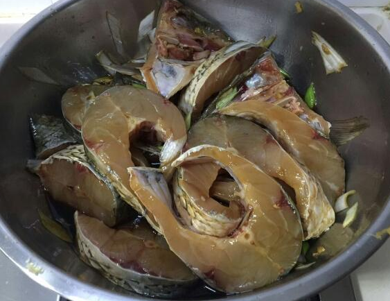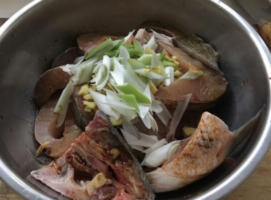 2.把魚放在容器里,切好的蔥、姜放上,準備腌入味。