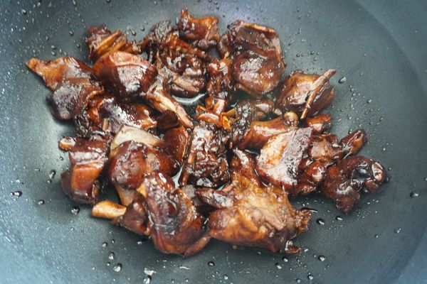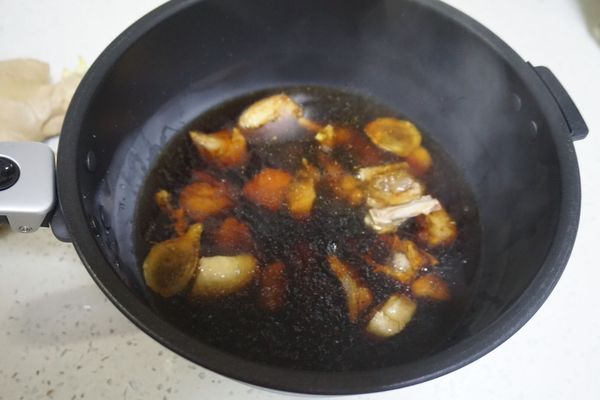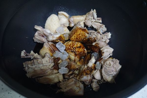 4、之所以說是快手菜,是因為有了九陽這款智能炒菜鍋,炒菜機變得輕松又省力。把煸好的老姜墊底,放入鴨肉,再加入適量的生抽和蠔油。加入一小把冰糖。