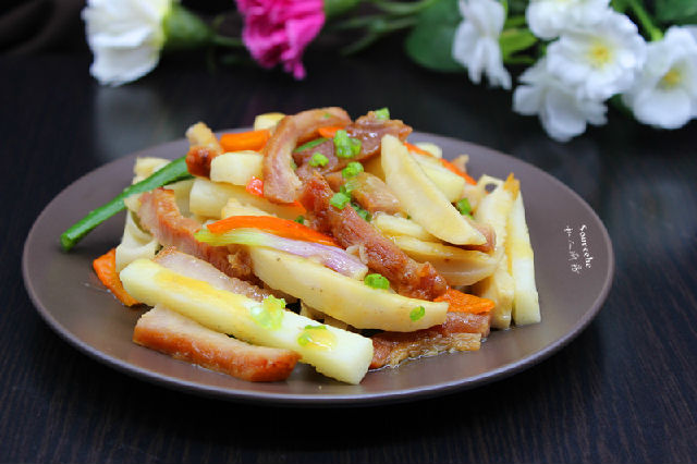 5.叉燒切長(zhǎng)條,加入鍋中翻炒;