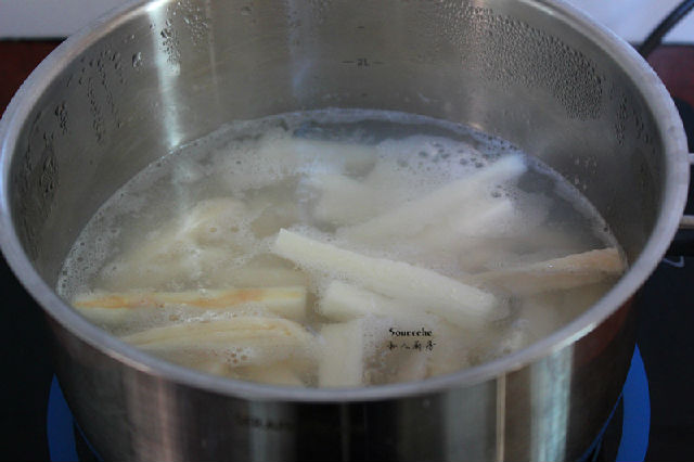 3.清水煮沸,放入放入蓮藕、山藥汆燙3分鐘,撈出瀝干水;