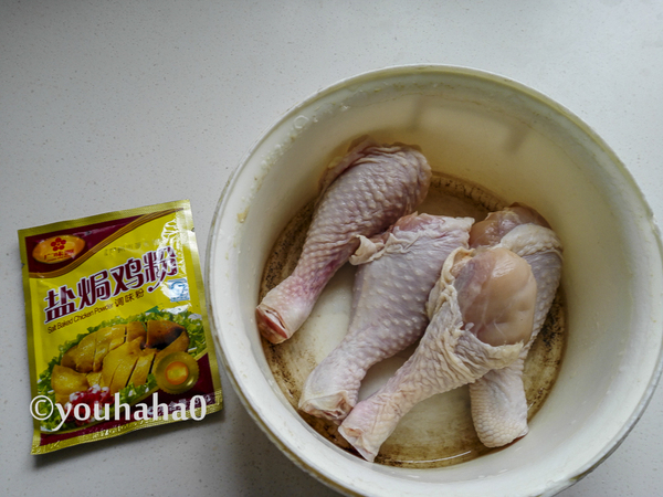 2、雞腿務(wù)必用鹽焗雞粉腌漬一個(gè)小時(shí)以上