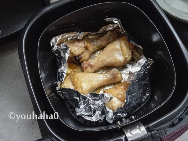 3、空氣炸鍋炸藍(lán)中鋪好錫紙,雞腿平放在錫紙上