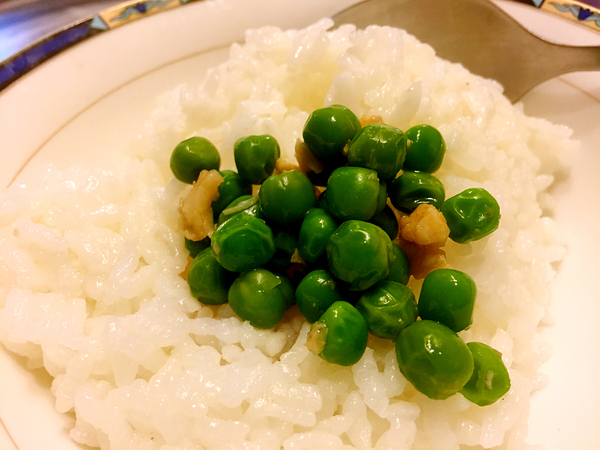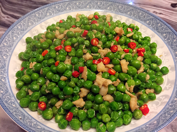 起鍋前放入紅辣椒,雞蓉?fù)?jù)說是1.2個(gè)大氣壓下如何如何做出來的,買的時(shí)候看商品描述覺得就是噱頭,但是吃起來竟然真的很好吃,彈潤鮮嫩,不像一般的雞胸肉輕易就柴了,配合著豌豆的鮮甜特別下飯
