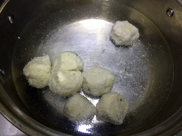 左邊灶眼上做一鍋水,把丸子放進(jìn)去