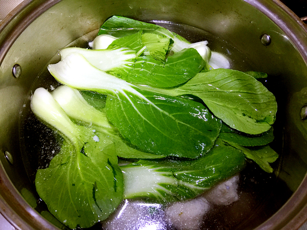 煮開之后放入洗好的小白菜,再煮3分鐘,臨關(guān)火放入泡軟的粉絲(前一天吃呷哺呷哺的蔬菜拼盤剩的……)