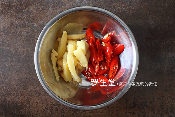 泡椒斜切小段,泡姜切片,蒜切片備用