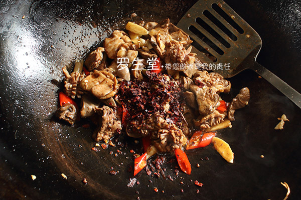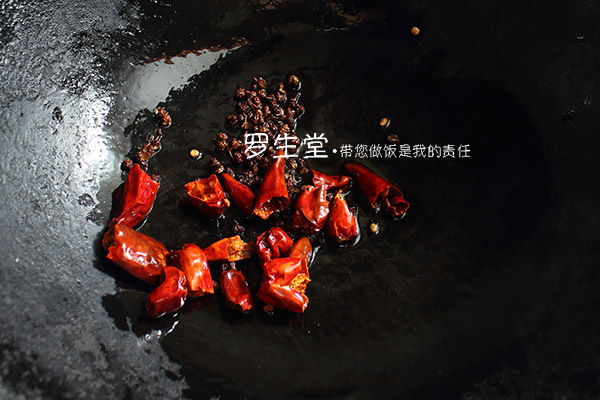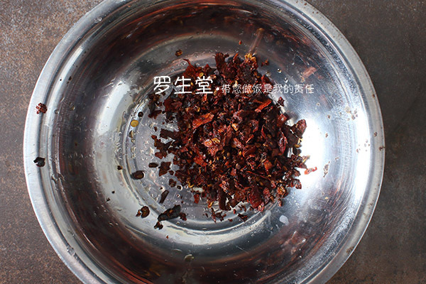 炒鍋內(nèi)放一點點油,先放花椒小火焙至快呈棕色時下干辣椒炒至棕紅色時撈出晾涼,用刀鍘碎備用