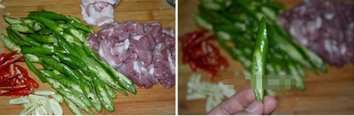 1、肉切片,把肥點(diǎn)的肉切出來單獨(dú)放,可以煎油,辣椒切成棱形塊,蒜切片。