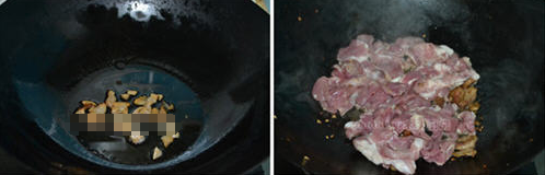 7、放入切好的肉片和油渣混合,大火爆炒。