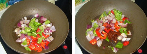 4、鍋里余油把洋蔥放入炒香,青紅椒塊放入加黃豆醬一起翻炒。