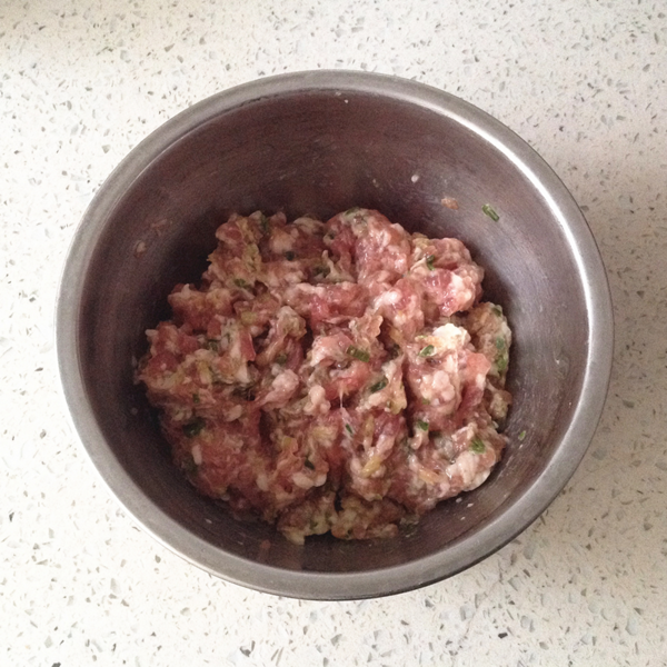 2、肉餡中調(diào)入蔥姜沫、醬油、料酒、鹽和橄欖油,用筷子順同一方向攪拌出勁兒備用。
