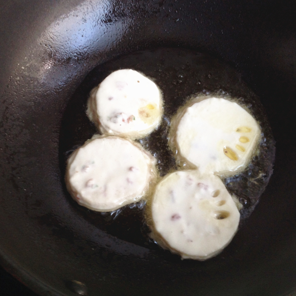 6、鍋中倒入食用油燒至8成熱時(shí),放入包裹了面糊的藕片。