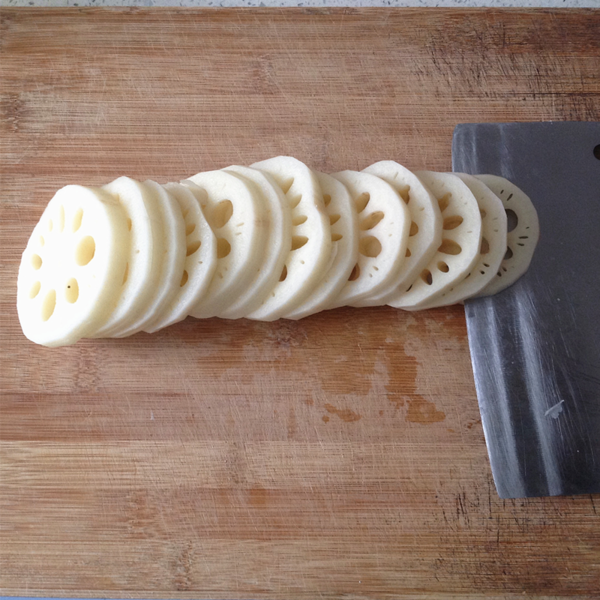 4、蓮藕控干水份,切成每?jī)傻兑黄s 5毫米厚,第一片切到藕的3/5左右不要切斷,第二刀切斷。