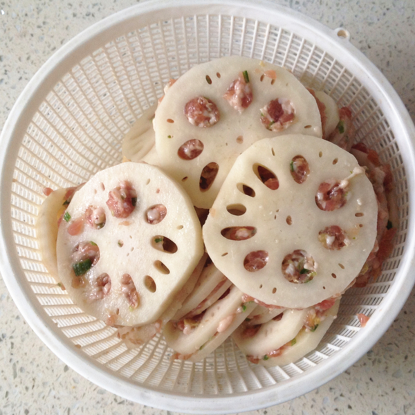 5、將切好的蓮藕片打開(kāi),中間均勻塞入肉餡。