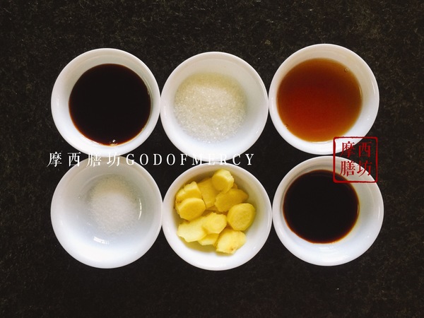 1 . 準(zhǔn)備好生抽、鹽、生姜、味極鮮、白糖、料酒等調(diào)制醬料。