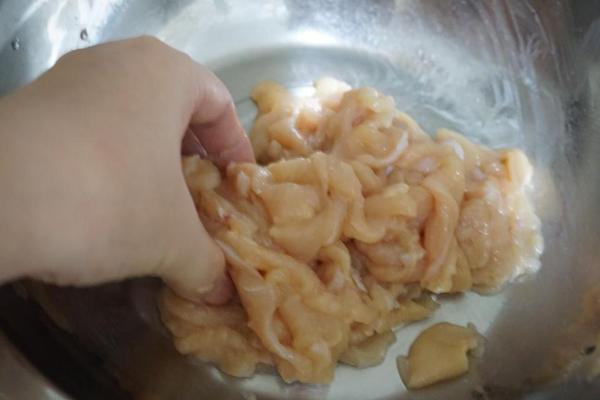 2、雞胸肉切片,加入1小勺料酒、少許鹽和適量淀粉,用手抓均勻。