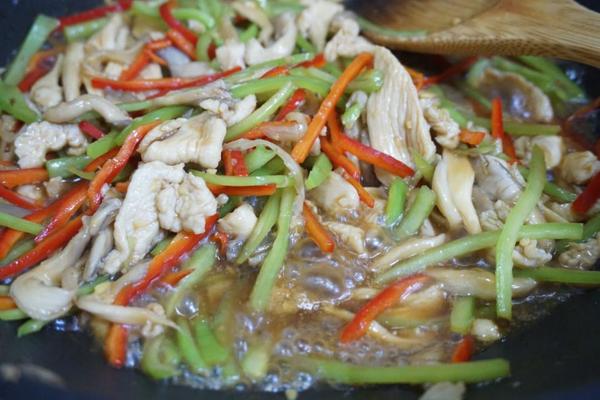 平菇本身就很鮮,用同樣嫩滑有脂肪量低的雞胸肉搭配,口感更棒,再放入微辣的紅綠兩色辣椒,不下飯才怪呢。