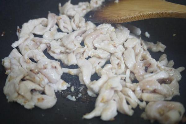 4、坐熱鍋子,鍋內(nèi)倒入食用油,爆香蔥姜末,放入雞絲,迅速炒散。