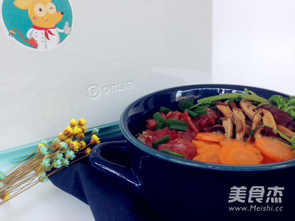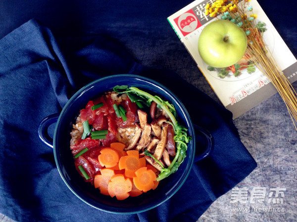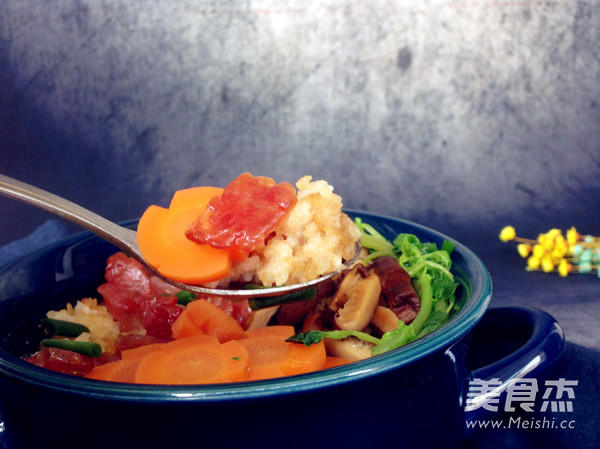 7.將菇和臘腸放在飯面上。
