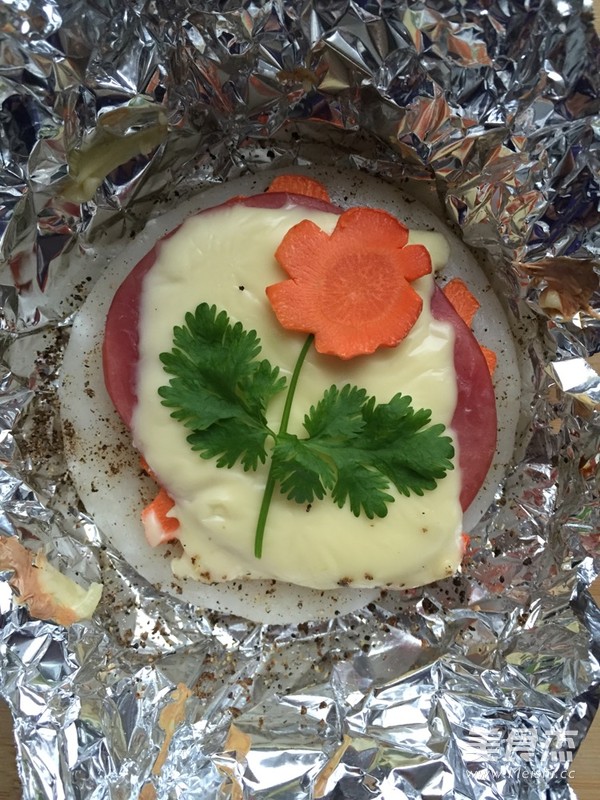 6.再放一片奶酪,包上錫紙,放入烤箱烤七分鐘左右