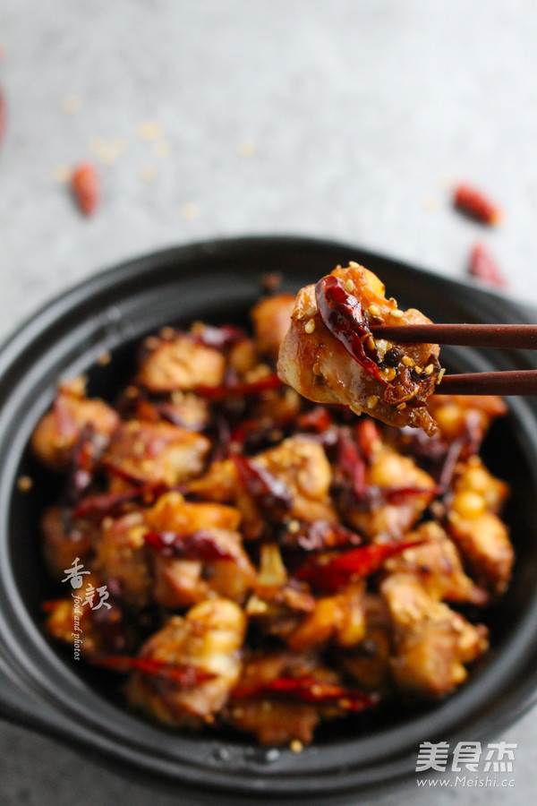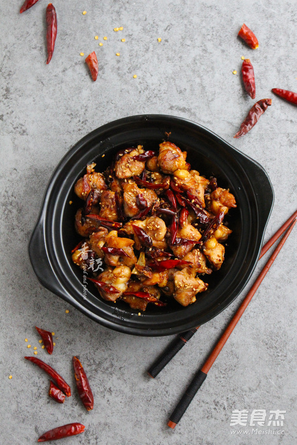 9.鍋放回灶臺(tái),倒入干辣椒和花椒略炒