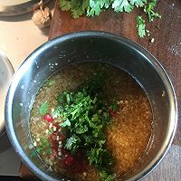 8. 把蒜茸辣椒圈放一起,加入青檸汁,魚露和糖漿調(diào)成汁,魚好了再把香菜切碎放入。