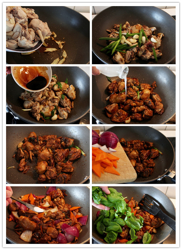 材料:雞腿3只(約)、小蔥2根、姜1塊(約20克)、蒜頭1個(gè)、九層塔盆栽1盆(約使用20克葉子)、紅皮洋蔥1個(gè)(約200克)、胡蘿卜1個(gè)(約100克)