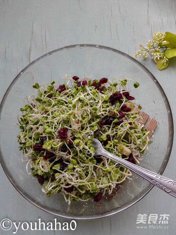 2.一根酸黃瓜切丁,放入蘿卜苗中,同時放入蔓越莓干