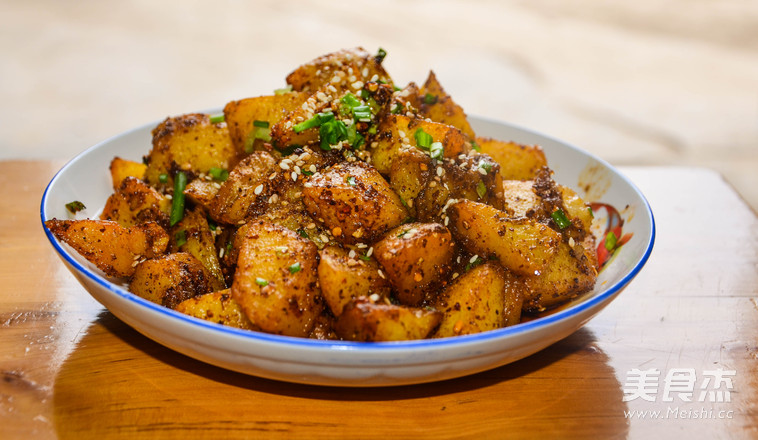 6.炒至蒜末微黃出香味后加入炸好的土豆翻炒均勻,加入辣椒面翻炒均勻,接著加入花椒面翻炒,加入生抽繼續(xù)翻炒,加入孜然粉和香蔥翻炒均勻盛出。撒上白芝麻,好了可以開吃啦