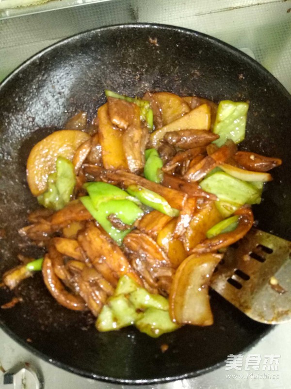 3.鍋里的油放入姜,八角,下入洋蔥炒香后放入過好油的食材,加入生抽老抽耗油,翻炒至土豆成熟后放入辣椒,繼續(xù)翻炒,因為我用的鑄鐵鍋比較厚,所以辣椒稍微一軟就關(guān)火出鍋